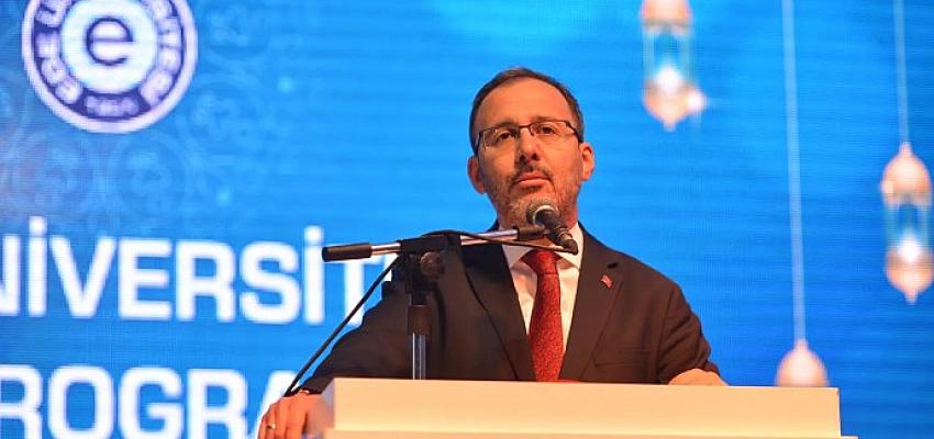 Gençlik ve Spor Bakanı Dr. Mehmet Muharrem Kasapoğlu, “Böylesine kutlu bir ayda, bir bereket ikliminde bir mağfiret, rahmet ikliminde sizlerle bir aradayız. Bizleri böylesine güzel bir vesileyle buluşturan Rabbimize hamdediyoruz. Ramazanlar, manevi duygularımızın en yoğun olduğu aylar. Ben gençlerimizle de bu vesileyle her bir iftar sofrasında farklı bir ilde, farklı bir yurtta bir araya gelmeye çalışıyorum. Bugün iftar öncesi Zübeyde Hanım Yurdundaki öğrencilerimizle beraberdik. Gece sahurda ise, İnciraltı Yurdundaki öğrencilerimizle beraberdik. Bu vesileyle bu güzel organizasyonda emeği geçen başta kıymetli Ege Üniversitesi Rektörümüz Prof. Dr. Necdet Budak'a, değerli üniversite yönetimimize ve burada bizlerle beraber olan herkese canı gönülden teşekkürlerimi sunuyorum” dedi.