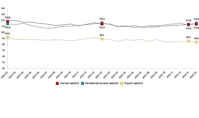 Mevsim etkilerinden arındırılmış güven endeksi Şubat ayında bir önceki aya göre; hizmet sektöründe aynı düzeyde kalarak 113,8 değerini, perakende ticaret sektöründe %2,9 oranında artarak 115,9 değerini ve inşaat sektöründe %2,1 oranında azalarak 83,9 değerini aldı.