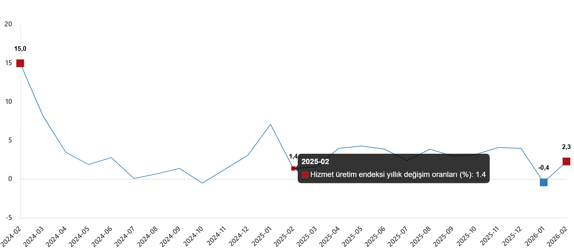 Hizmet üretim endeksi (2021=100) 2026 yılı Şubat ayında bir önceki yılın aynı ayına göre %2,3 arttı. Aynı ayda ulaştırma ve depolama hizmetleri %0,3 azaldı, konaklama ve yiyecek hizmetleri %3,5 arttı, bilgi ve iletişim hizmetleri %13,3 arttı, gayrimenkul hizmetleri %8,7 azaldı, mesleki, bilimsel ve teknik hizmetler %5,6 arttı, idari ve destek hizmetleri ise %1,4 arttı.