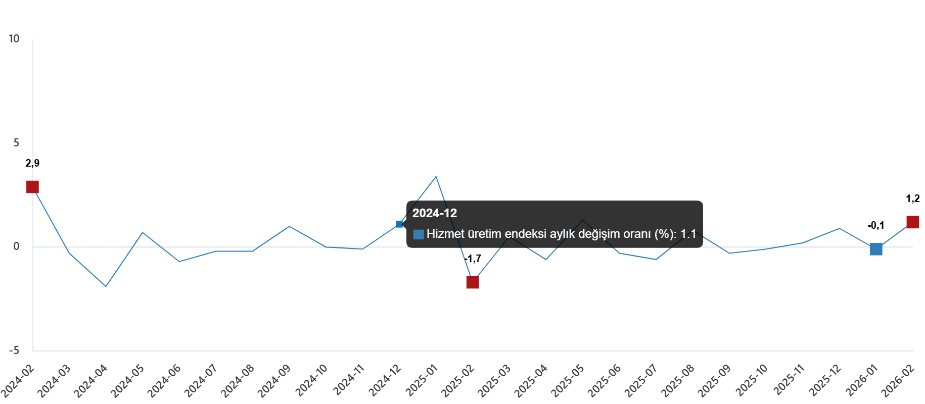Hizmet üretim endeksi aylık değişim oranı (%), Şubat 2026