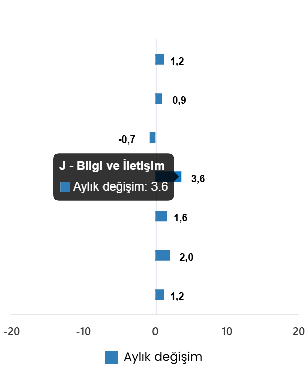 Hizmet üretim endeksi aylık %1,2 arttıHizmet üretim endeksi (2021=100) 2026 yılı Şubat ayında bir önceki aya göre %1,2 arttı. Aynı ayda ulaştırma ve depolama hizmetleri %0,9 arttı, konaklama ve yiyecek hizmetleri %0,7 azaldı, bilgi ve iletişim hizmetleri %3,6 arttı, gayrimenkul hizmetleri %1,6 arttı, mesleki, bilimsel ve teknik hizmetler %2,0 arttı, idari ve destek hizmetleri ise %1,2 arttı.