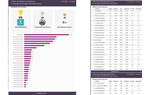 Bağımsız Boom Social tarafından Türkiye Geneli Büyükşehir Belediyeleri arasında yapılan Sosyal Medya Kullanım Performans Analizine göre Kocaeli Büyükşehir Belediyesi, 2023 yılında 30 Büyükşehir Belediyesi arasında aldığı beğeni ve etkileşimlere göre 1. oldu. Sosyal medyadaki üstün performansıyla beğeni toplayan Kocaeli Büyükşehir, genel performans değerlendirmesinde Instagram, Facebook ve YouTube olmak üzere üç platformda Türkiye 1.si olurken X’te ise 6. oldu. VATANDAŞLAR HİZMETLERİ VE PROJELERİ TAKİP EDEBİLİYORDijital dünyanın öneminin arttığı günümüzde, bu değişime ayak uyduran Kocaeli Büyükşehir Belediyesi tarafından halka sunulan hizmetlerin ve hayata geçirilen projelerin ilerlemeleri en güncel hali ile sosyal medyadan da takip edilebiliyor. KOCAELİ’NİN TANITIMINA BÜYÜK KATKI SAĞLANIYORKocaeli Büyükşehir Belediyesi’nin hizmet tanıtımları, etkinlik canlı yayınları, proje ve yatırım bilgilendirmelerinin yanı sıra Kocaeli’nin tanıtımına yönelik video, fotoğraf ve drone çekimleri sosyal medyada hem Kocaeli hem diğer illerde yaşayan takipçiler tarafından büyük beğeni topluyor. BÜYÜKŞEHİR BELEDİYELERİ SIRALAMASITüm sosyal platformlarda @KOCAELIBLD adıyla takip edilen Kocaeli Büyükşehir Belediyesi’nin Facebook, Instagram, YouTube ve (Twitter) X’te 2023 yılında aldığı toplam 6 milyon 178 bin 384 etkileşim ile birinci olduğu sıralamada, Gaziantep ikinci, Ankara Büyükşehir üçüncü, İstanbul Büyükşehir dördüncü, Diyarbakır Büyükşehir Belediyesi ise beşinci oldu. 6 MİLYONDAN FAZLA ETKİLEŞİMLE ZİRVEDESosyal medyayı etkili kullanan Kocaeli Büyükşehir Belediyesi, 2023 yılı Türkiye Büyükşehir Belediyeleri Sosyal Medya Kullanım Performans Analizi’ne göre Instagram’da 5 milyon 092 bin 617, Twitter'da 289 bin 567, Facebook’ta 764 bin 348, Youtube’ta 31 bin 852, toplamda ise 6 milyon 178 bin 384 etkileşim sayısıyla zirvede yer aldı. Kaynak: (BYZHA) Beyaz Haber Ajansı
