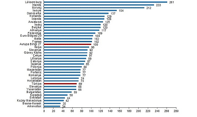 Avrupa Birliği İstatistik Ofisi (Eurostat) tarafından açıklanan SGP'ye göre kişi başına gayrisafi yurt içi hasıla (GSYH) endeksi 2022 yılı geçici sonuçlarına göre 27 Avrupa Birliği (AB) ülkesi ortalaması 100 iken, bu değer Türkiye için 69 oldu ve AB ortalamasının %31 altında kaldı.